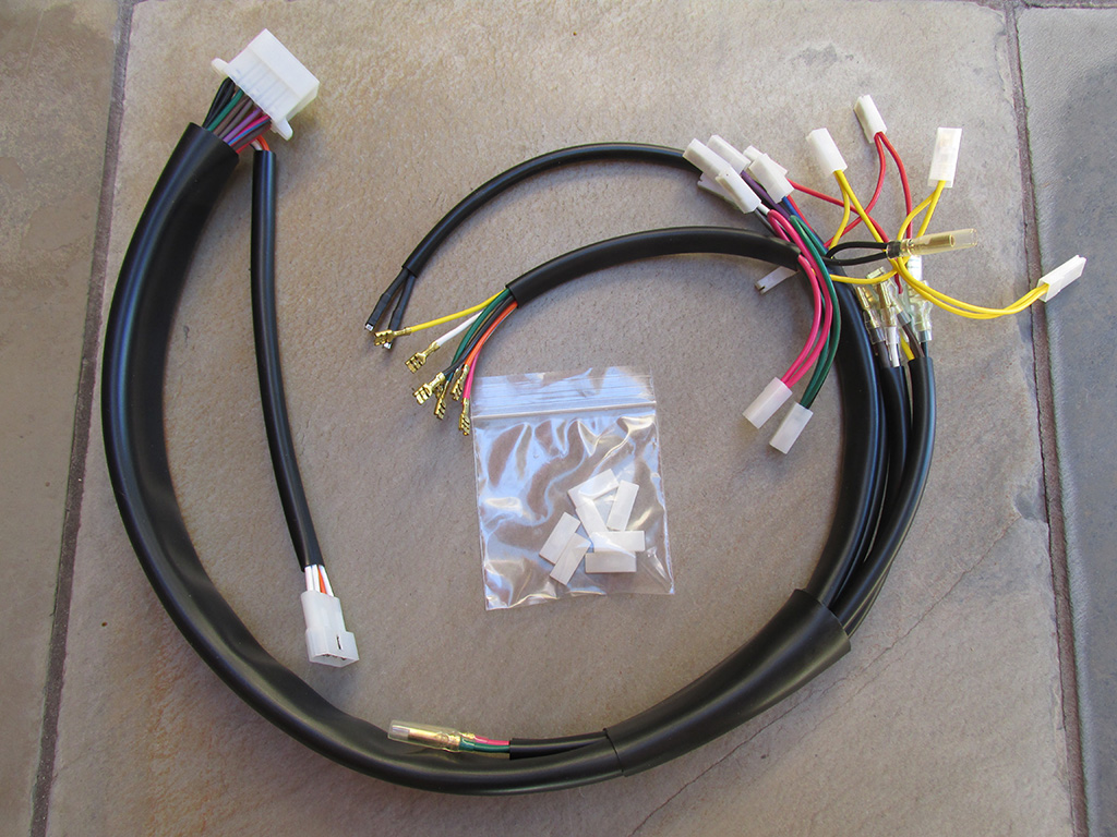 Wiring for universal left handlebar switches (headlight, parking lights, horn, turn signals) Works great with the multitude of universal switches available. Butt connectors and heat shrink are included to splice the sub-harness directly to the wires from the switch. Wire connections should be staggered to yield a smaller overall finished diameter. Larger diameter sheathing is provided to aid routing the spliced wires through the sheathing after all of the connections have been made. Wires to the headlight plug are 800 mm in length. Wire to ground is 1000 mm in length. Wires are intentionally left separate from the 12 terminal plug - so that the wires may be more easily spliced and routed through the sheathing or inside the handlebar.