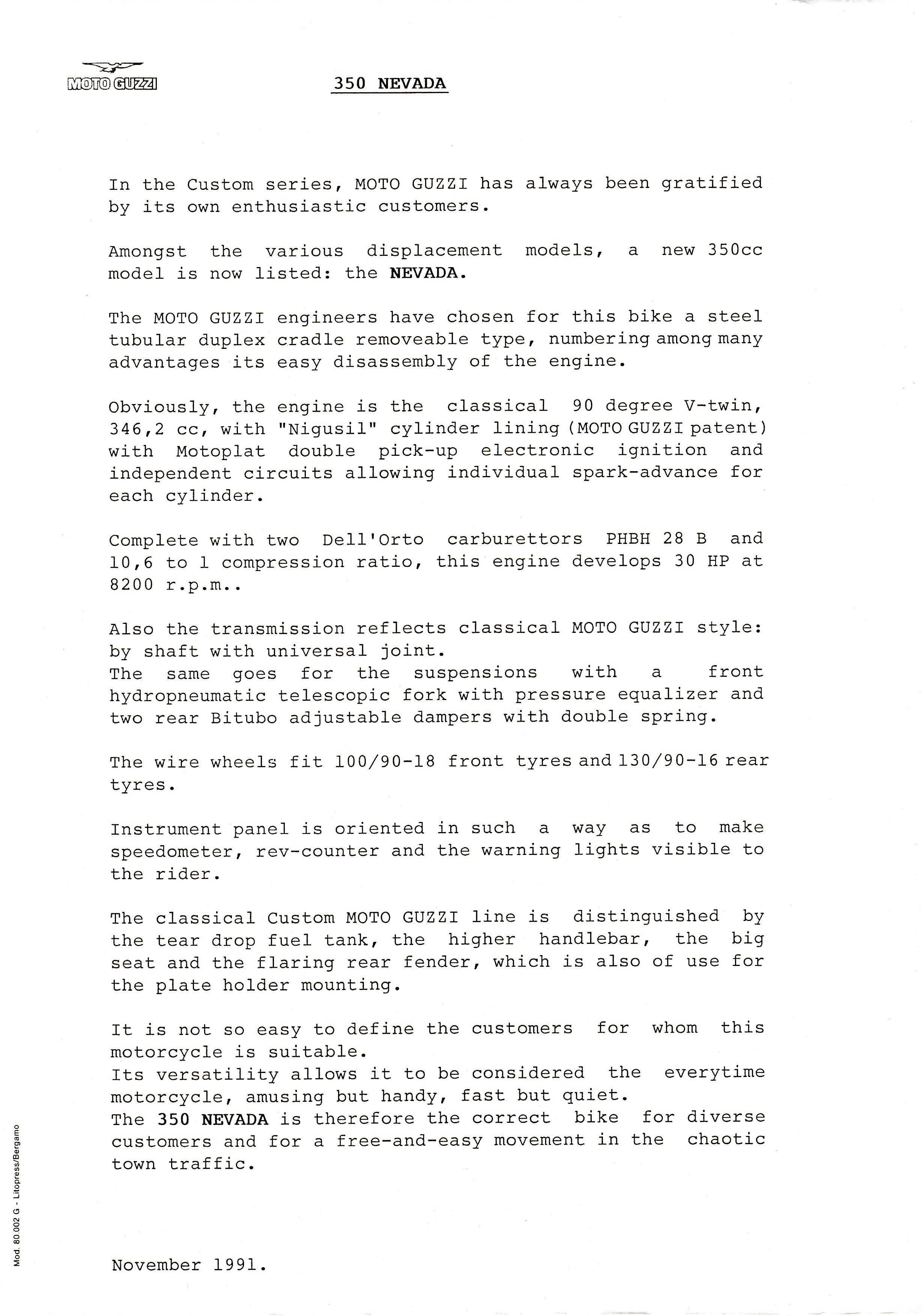 Technical informationMoto GuzziMore Moto Guzzi topicsPress release - Moto Guzzi 350 Nevada (1991 November)Advertisements, articles, brochures, catalogs, flyers, photos, press releases, price lists, tags, technical bulletins, etc.Created: 2016 January 12Updated: 2016 January 12View more topics related to Moto Guzzi More Moto Guzzi topicsPress release - Moto Guzzi 350 Nevada (1991 November)Photo courtesy of Gregory Bender.Press release - Moto Guzzi 350 Nevada (1991 November)Photo courtesy of Gregory Bender.Direct link to imageView more topics related to Moto Guzzi More Moto Guzzi topics